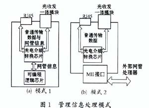 收發(fā)器網(wǎng)管功能的實(shí)現(xiàn)有兩種方式:一種是在收發(fā)器電路板上配置網(wǎng)絡(luò)管理信息處理器——可編程邏輯芯片來(lái)處理網(wǎng)管信息,該芯片利用OEMC上的雙向管理指令接口(Managenent Data Input/Output,MDIO)、管理數(shù)據(jù)同步時(shí)鐘輸入接口(ManagenentData Clock,MDC)及被管理信息輸入/輸出管腳等接口來(lái)獲取管理信息,管理信息與網(wǎng)路上的普通數(shù)據(jù)共用數(shù)據(jù)通道,如圖1(a)所示。第二種方式如圖1(b)所示,收發(fā)器上沒(méi)有管理信息處理器,收發(fā)器外部的網(wǎng)絡(luò)管理者通過(guò)MII接口獲取管理信息??梢?jiàn),有網(wǎng)管功能的收發(fā)器,其元器件種類及數(shù)量遠(yuǎn)遠(yuǎn)多于無(wú)網(wǎng)管收發(fā)器,相應(yīng)地,其布線復(fù)雜,開(kāi)發(fā)周期長(zhǎng)。