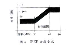 雙絞線中的每對(duì)導(dǎo)線以雙螺旋形結(jié)構(gòu)相互纏繞。如圖2所示,共模電流Icom在兩根導(dǎo)線上以相同方向流動(dòng),并經(jīng)過(guò)寄生電容Cp到地返回。在這種情況下,電流產(chǎn)生大小相等極性相同的磁場(chǎng) ,它們的輸出不能相互抵消,引起射頻干擾,嚴(yán)重時(shí)有可能會(huì)造成電路板癱瘓。因此,設(shè)計(jì)者必須采取措施予以防范:除了保證布線合理外,選擇有效的濾波元件也是重要的一方面。磁模塊的共模扼流器部分可以有效地減少共模信號(hào)引起的射頻干擾。如圖3所示:共模電流以相同的方向流過(guò)共模扼流圈繞組的每一邊,建立大小相等相位相同的相加磁場(chǎng)使共模扼流圈對(duì)共模信號(hào)呈現(xiàn)高阻抗,通過(guò)共模扼流圈的共模電流大大地減弱。磁模塊主要的參數(shù)有:漏電感、線間電容和回?fù)p。一般地,漏電感和線間電容越小性能越好,而回?fù)p應(yīng)當(dāng)符合ANSIX3.263 TP-PMD規(guī)定,如圖4所示。