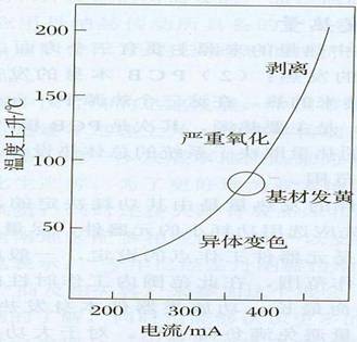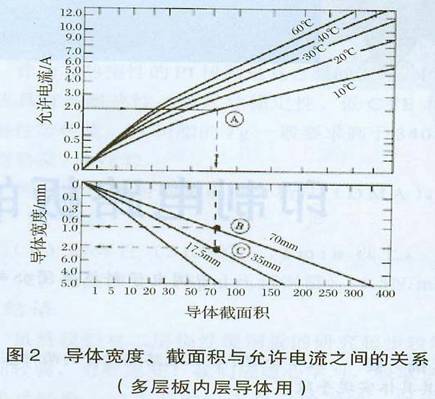 值得注意的是,當導體圖形溫度上升到85℃左右時,絕緣材料自身開始發(fā)黃(圖1),電流繼續(xù)通過,最后銅圖形熔斷,特別是多層板內層圖形,周圍都是傳熱性差的樹脂,散熱困難,因而溫度不可避免地上升,所以特別要注意導體圖形線寬的設計。實際上在進行PCB布線設計時走線線寬主要依據(jù)其發(fā)熱量和散熱環(huán)境來確定的。銅導體的截面積決定了導線電阻(數(shù)字電路中線電阻引起的信號損耗可忽略不計),銅導體和絕緣基材的導熱率影響溫升,進而決定載流量。圖2是普通FR-4覆銅箔板銅導體圖形線寬及截面積與允許電流之間的關系圖。從圖中可以看出:導體圖形截面積一定,當其允許電流值為2A,溫度上升值低于10℃時,對于35Um銅箔,其線寬應設計為2mm:對于70um銅箔,其線寬應設計為lmm。由此得出:當導體的截面積、允許電流和溫度上升值一定時,可通過增加銅箔厚度或加大線寬值兩個方面來滿足走線的散熱要求。