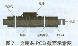 金屬板嵌入多層印制板的中間,其典型結構如圖7金屬芯板本身也可作為地層使用,其上下層可通過金屬化孔(與芯板絕緣)互聯(lián),并通過導熱孔實現(xiàn)熱量在金屬芯板內層和表面的傳遞。如圖7所示,發(fā)熱元件可通過底部和導熱孔直接焊接在板面上,發(fā)熱器件產(chǎn)生的熱直接傳遞到金屬芯板,由金屬芯板經(jīng)導熱孔傳給接觸的安裝機箱而散發(fā)出去;熱量較大時可銑去芯板兩邊的絕緣層,通過邊緣裸露的金屬芯板與機座接觸散熱,因此具有良好的散熱效果。對處于密閉機箱中的電路散熱是一種較好的選擇金屬芯PCB的芯材通常有鋁、銅、鋼等,后來開發(fā)出了覆銅因瓦復合材料(CIC),它不僅具有良好的導熱性,而且其熱膨脹系數(shù)與半導體器件匹配性好,所制成的CIC金屬芯板可應用于要求高可靠性、高組裝密度、高功率、高性能的軍用電子設備中。