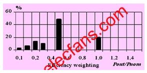 對于傳統(tǒng)電力電子裝置的設計,我們通常是通過每千瓦多少錢來衡量其性價比的。但是對于光伏逆變器的設計而言,對最大功率的追求僅僅是處于第二位的,歐洲效率的最大化才是最重要的。因為對于光伏逆變器而言,不僅最大輸出功率的增加可以轉(zhuǎn)化為經(jīng)濟效益,歐洲效率的提高同樣可以,而且更加明顯。歐洲效率的定義不同于我們通常所說的平均效率或者最高效率。它充分考慮了太陽光強度的變化,更加準確地描述了光伏逆變器的性能。歐洲效率是由不同負載情況下的效率按照不同比重累加得到的,其中半載的效率占其最大組成部分(見圖1)。