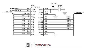 通過軟件參與設(shè)置,很容易得到全頻段內(nèi)的預(yù)置誤差數(shù)據(jù)。對于2-20GHz的微波振蕩器,如果每隔5MHz設(shè)置補(bǔ)償一個(gè)點(diǎn),那么存儲器至少需要3600個(gè)地址空間,在此選擇8k×8靜態(tài)存儲器芯片,存儲空間滿足要求。在時(shí)鐘的同步控制下,地址生成器產(chǎn)生對應(yīng)地址,該系列數(shù)據(jù)被存入RAM中,電路如圖5所示。