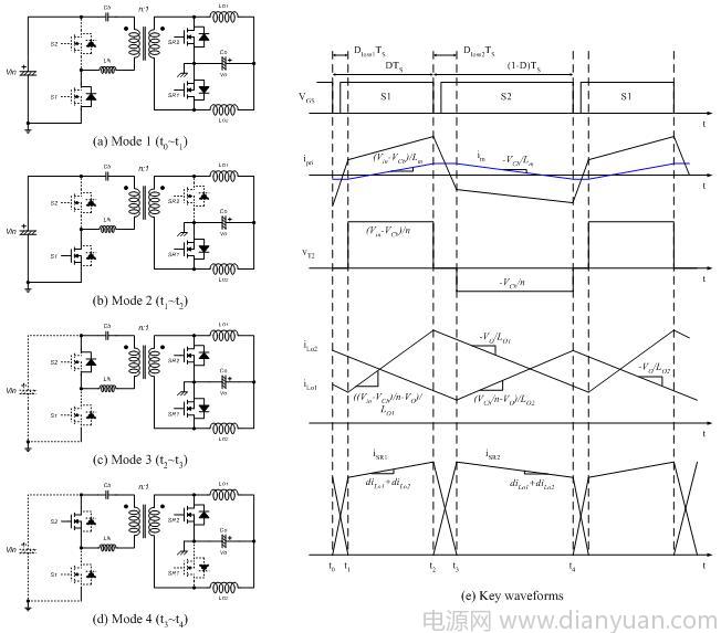 當 S2 關斷,模式 1 作為另一個重建模式而開始,模式 1 的運作原理幾乎與模式 3 相同,只有 ZVS 狀況例外。在模式 1 中,當 S1 的輸出電容電壓等于 Vin-VCb 的瞬間,vT1 成為零。在這個瞬間之前,輸出電感 LO2 上的負載電流反射到變壓器的初級端,有助于實現開關的 ZVS 運作。與此相反,存儲在漏電感中的能量僅在這個瞬間之后對輸出電容進行放電和充電。因而,S1的 ZVS 運作較 S2 更為穩(wěn)固,因為通常 Vin-VCb 高于 VCb ,除此之外,可以與模式 3 相同的方式進行分析,模式 1 的延續(xù)時間為