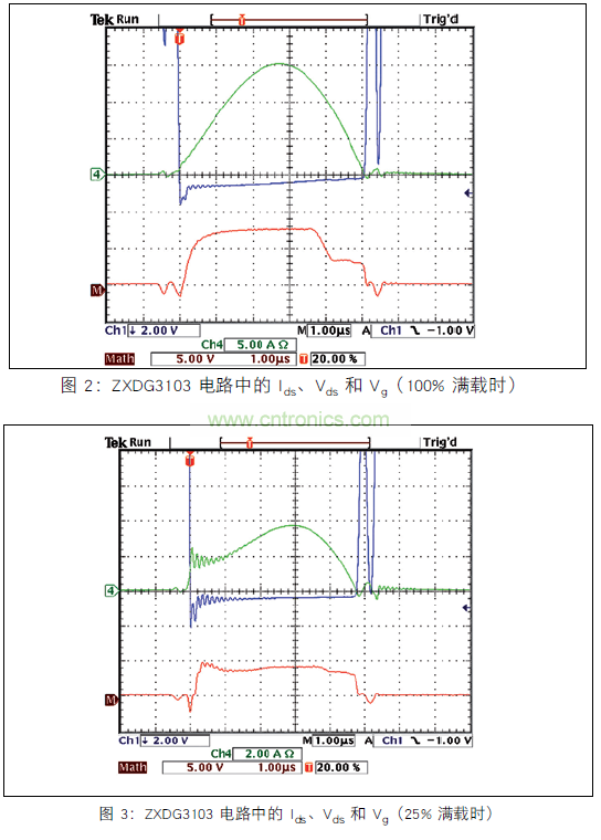 在滿載測試電路中,柵極驅(qū)動電壓在正弦電流開始減少時早期終止,這可能是由電路的電感和 Q1 TO-220 封裝的電感造成的。 與前面使用 ZXGD3103 的測試一樣,對布局進行改進、減少阻抗和選擇低電感的封裝應(yīng)該可以解決此問題。