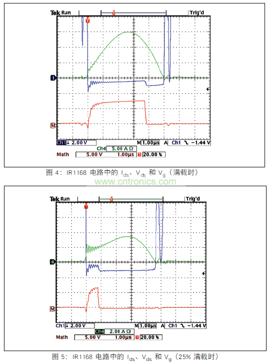 在這兩個圖中,令人關(guān)注的是快速柵極驅(qū)動電壓。在探測到寄生二極管在 MOSFET 中的正向壓降之后約 200 納秒內(nèi),Q1 打開,減少其電壓 (Ch1 - Vds)。 在這兩個測試中,Q1 Vds 均高于預(yù)期。 這可能由電路電感和示波器的容量造成的。在滿載情況下,柵極驅(qū)動電壓在正弦電流開始減少時下降。這可能是電路的電感和 Q1 TO-220 封裝的電感造成的。對布局進行改進并選擇低電感的封裝應(yīng)該可以解決此問題。