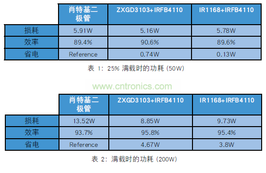 對布局進行改進并選擇低電感的MOSFET封裝后,兩個同步整流電路展示了更高的效率;因此,表中所示的 ZXGD3103與 IR1168 電路之間的略微差別不是嚴重問題。令人清楚的一點是,通過遵照制造商的應(yīng)用指南,在實施設(shè)計不太完美的電路后是有可能大幅度節(jié)省電源的。
