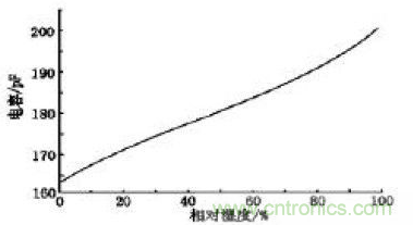 目前, 生產(chǎn)濕敏電容的主要廠家是法國Humirel 公司。它生產(chǎn)的HS1101 測量范圍是0%~100%RH,電容量由162PF 變到200PF,其誤差不大于±2%RH;響應時間小于5S;濕度系數(shù)為0.34PF/℃;年漂移量0.5%RH/年,長期穩(wěn)定。圖1 為HS1101 濕敏電容的濕度-電容響應曲線。