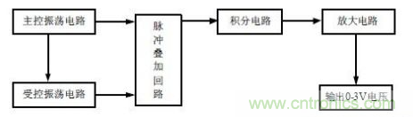 HS1101在電路中相當于一個電容器件,它的電容量隨著所測空氣濕度的增加而增大,為了能將電容的變化轉換成電壓的變化,我們設計了振蕩電路、消除零點電容影響電路、整流電路、積分電路、電壓—電流轉換電路、放大電路等,其工作原理簡圖如圖2 所示。