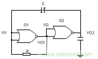 振蕩電路的作用是將電容的變化量轉化為頻率可變的方波。由圖3 可知,這是一個非對稱多諧振蕩器。或非門G1 工作在電壓傳輸特性的轉折區(qū),把它的輸出電壓直接連接到或非門G2 的輸入端。G2即可得到一個介于高低電平之間的靜態(tài)偏置電壓,從而使G2 的靜態(tài)工作點也處于電壓傳輸特性轉折區(qū)上。反饋環(huán)路中電容使電路在兩個暫穩(wěn)態(tài)之間往復振蕩。