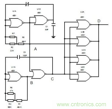 只要調整C 的脈沖寬度,就可以得到D 的脈沖寬度,從而可以消除零點電容,經(jīng)過調制的電容變化信號也就是濕度信號。將同一封裝內的門電路U2A、U2B、U2C、U2D 并聯(lián)使用,可以擴大CMOS 門電路輸出低電平時吸收負載電流的能力。