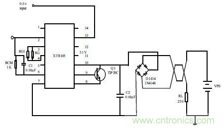 輸出的0~3V 電壓通過XTR105 芯片的2 和13 引腳輸入。調整3 和4 引腳間的電阻RG和RG1 的值,可以改變XTR105 芯片的內置儀表放大器增益值,從而選定合適的測量范圍。RCM 取為1KO,它提供一個附加電壓降,使XTR105 的輸入電壓限制在共模方式下的電壓范圍內。與RCM 并聯(lián)的0.01μF 旁路電容用于降低共模噪聲。