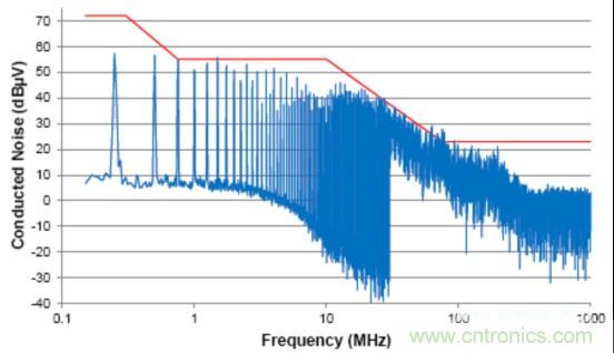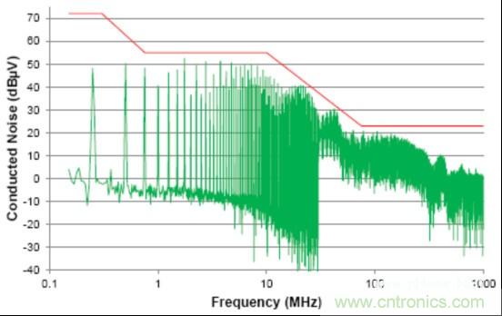 由于信號(hào)的共模部分能夠與系統(tǒng)(或與外部系統(tǒng))中的其它分量耦合在一起(通過輻射或傳導(dǎo)路徑),這個(gè)共模噪聲直接影響放射性能。這個(gè)器件的傳導(dǎo)放射按照工業(yè)電氣工程/電子 (IBEE) 茨維考技術(shù)的工程服務(wù)進(jìn)行測量;如圖2中所示,這個(gè)器件的傳導(dǎo)放射連同一個(gè)普通汽車原始設(shè)備制造商(OEM)限值線一同繪制。