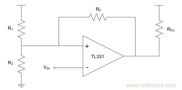 下面的例子所示為安森美半導(dǎo)體TL331配置為一個(gè)反相施密特觸發(fā)器。L331是無內(nèi)部滯回的單通道、低功耗、集電極開路的比較器。由R1和R2電阻創(chuàng)建的電阻分壓器在非反相引腳上設(shè)置參考電壓,在比較器輸出開關(guān)處設(shè)置閾值電壓。由于這是一個(gè)集電極開路的比較器,所以連接一個(gè)上拉電阻到輸出。反饋電阻通過正反饋增加滯回。通常情況下,使用一個(gè)比較大的反饋電阻值,至少100 KΩ。