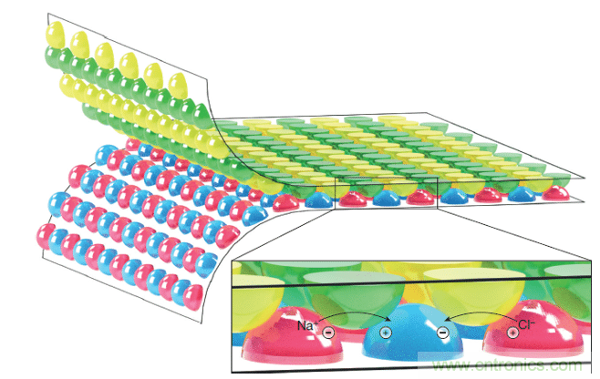 紅色凝膠含有鹽水,而藍色凝膠含有淡水。離子原本會從紅色凝膠流向藍色凝膠,但由于基板的間隔,無法出現(xiàn)這樣的流動。與此同時,與這塊基板對應的另一塊基板上布置了綠色和黃色凝膠,當它們橋接在藍色和紅色凝膠之間的空隙時,就能為離子運動提供通道。