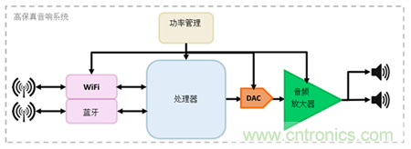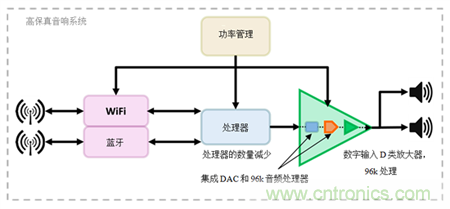 處理器執(zhí)行各種音頻處理功能,如解碼和信號均衡,同時也處理Wi-Fi和/或藍牙通信軟件堆棧。過去,CD品質(zhì)的采樣頻率可能已足夠。但是今天的高保真音頻系統(tǒng)對信號鏈中的處理器提出了其它要求,因為高保真音質(zhì)要求在24位音樂信號流中提供48kHz至192kHz范圍內(nèi)的采樣率。