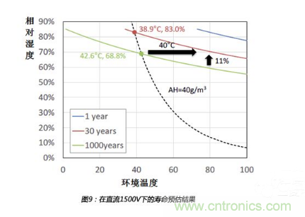 從上圖可以看出,相對濕度增加11%或者溫度增加40℃,都會造成壽命從1000年減為30年,所以,相對來說,相對濕度的影響比溫度影響更大。一般來說,當(dāng)變流器內(nèi)部升溫時,絕對濕度會保持不變。如果環(huán)境條件從溫度38.9℃、相對濕度83.0%變?yōu)闇囟?2.6℃、相對濕度68.8%,但是絕對濕度值保持40g/m3,壽命會從30年增加到1000年。所以,預(yù)加熱是一種非常有效的抑制濕度失效的方法。