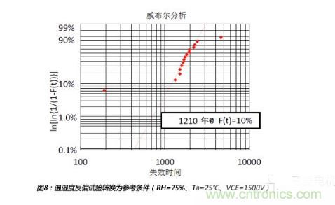 以上失效點(diǎn)集成為圖8所示的威布爾曲線圖,從圖中可以得到,在參考條件下F(t)=10%的壽命為1210年。同時,在此威布爾分析中,排除了最大點(diǎn)和最小點(diǎn)。所以,在參考條件下,3.3kV IGBT的壽命LTb=1210年。