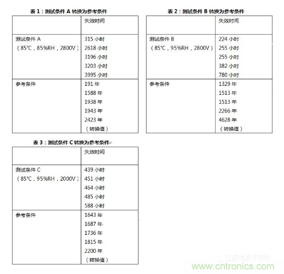 這里,參考條件定義為RHu=75%,Tu=25℃和Vu=1500V。通過公式(1),可以得到測試條件A中的加速因子αf_A為5.31k,測試條件B中的加速因子αf_B為52.0k,測試條件C中的加速因子αf_B為32.8k。綜合這些加速因子,溫濕反偏試驗測試A、測試B和測試C轉(zhuǎn)換為如表1、表2和表3所示的參考條件。