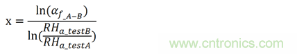 如圖4所示,在測試條件A的平均壽命為3023個小時。同樣,如圖5所示,在測試條件B的平均壽命為309個小時。所以,從相對濕度85%到相對濕度95%,加速因子αf_A-B通過計算為3023/309=9.78。相對濕度的經(jīng)驗影響因子x通過下式計算: