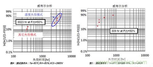 3.3kV高壓IGBT的溫濕反偏試驗是在以下三個條件下測試:測試條件A(Ta=85℃,相對濕度=85%, VCE=2800V),測試條件B(Ta=85℃,相對濕度=95%, VCE=2800V),測試條件C(Ta=85℃,相對濕度=95%, VCE=2000V),測試結(jié)果如圖4,圖5和圖6所示。