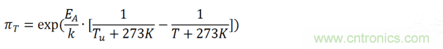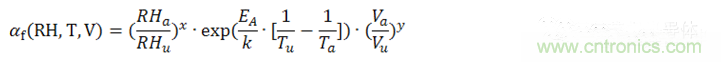 公式中,αf為測試的加速因子,也就是加速(后綴為a)測試條件下MTTF(Mean Time To Failures,平均無故障時間)與參考(后綴為u)測試條件下MTTF之比。EA是活化能,在0.79eV和0.95eV之間,k為玻爾茲曼常數(shù)。指數(shù)x為相對濕度的影響,指數(shù)y為電壓的影響,都是經(jīng)驗數(shù)據(jù),但是必須通過實際評估來確認(rèn)。我們把此加速模型擴(kuò)展到壽命預(yù)估模型中。