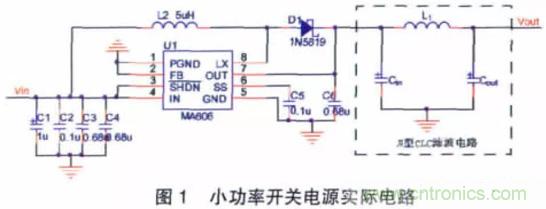 設(shè)計電路如圖1 所示,測試時輸入端使用3.6 V 的鋰電池進行供電,使用π 型CLC 低通濾波電路對MAX606 輸出端進行紋波濾波。