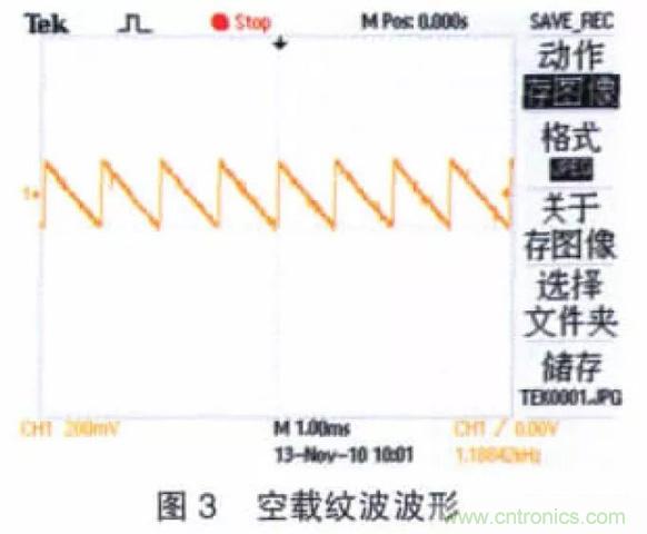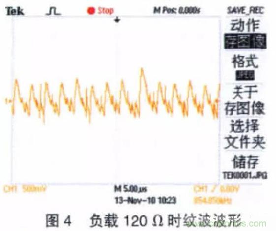 圖3 所示為空載時MAX606 輸出電壓紋波波形(Uo≈12 V),即開關(guān)紋波,其頻率為1.18 kHz,波形穩(wěn)定,Vpp=240 mV。圖4 所示為負(fù)載120 Ω 時輸出電壓的紋波波形,從圖4 中可以看出加入負(fù)載后電源紋波變得比較復(fù)雜,其最高Vpp達到1.2 V。為系統(tǒng)供電時,該紋波將會對系統(tǒng)造成嚴(yán)重危害,必須對此紋波進行抑制。