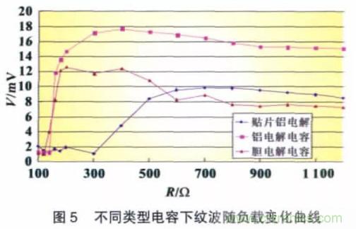 在圖1 的CLC 濾波電路中,Cin、Cout 分別使用三種常見類型的電解電容(容值為220 μF/16 V),電感使用環(huán)形電感(電感值120 μH),依次改變負(fù)載大小,使用交流毫伏表測量其紋波電壓有效值,得到如圖5 所示的曲線圖。