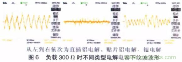圖6 所示為負(fù)載是300 Ω 時不同類型電解電容下所測量到的紋波波形,可以明顯看出使用貼片鋁電解紋波最小,使用普通鋁電解紋波較大且紋波具有毛刺,使用貼片鉭電解紋波有所減小且毛刺也有很大程度的改善。