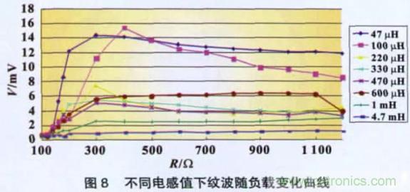 2.2.3 不同電感值下紋波隨負(fù)載的變化
