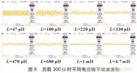 圖9 所示為負(fù)載為300 Ω 時不同電感值下紋波波形圖,從圖9 中可以看出,隨電感值增大,紋波被抑制程度越大,輸出紋波越小。當(dāng)電感值增大到1 mH 時,紋波效果最好,且輸出基本上沒有毛刺。