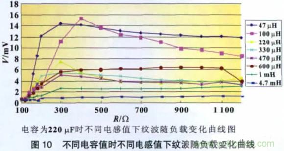 圖10 所示為在不同電容值(貼片鉭電解)下,改變電感和負(fù)載并測量負(fù)載上的電源紋波有效值所得出的曲線圖。