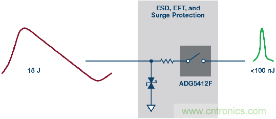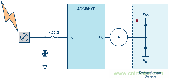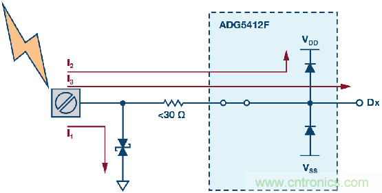 圖4也展示了高壓瞬變事件過(guò)程中的各種電流路徑。大部分電流通過(guò)TVS器件分流到地(路徑I1)。路徑I2展示的是通過(guò)ADG5412F輸出節(jié)點(diǎn)上的內(nèi)部ESD消耗的電流,同時(shí),輸出電壓被箝位于比電源電壓高0.7 V的水平。最后,路徑I3中的電流是下游器件必須承受的剩余電流水平。有關(guān)該保護(hù)電路的更多詳情,請(qǐng)參閱ADI公司應(yīng)用筆記AN-1436。