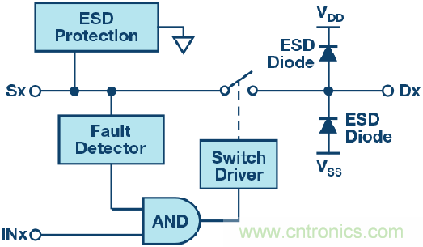 圖2顯示了一個(gè)典型過(guò)壓保護(hù)開(kāi)關(guān)的功能框圖;注意,該開(kāi)關(guān)的ESD保護(hù)二極管未以其輸入節(jié)點(diǎn)上的電源電壓為基準(zhǔn)。相反,它有一個(gè)ESD保護(hù)單元,在超過(guò)器件最大承受電壓時(shí)激活,使器件能承受并阻斷超過(guò)其電源電壓的電壓。由于模擬系統(tǒng)通常只要求開(kāi)關(guān)的外向引腳采用IEC保護(hù),所以,ESD保護(hù)二極管依然保留在內(nèi)向引腳上(標(biāo)志為開(kāi)關(guān)輸出端或漏極端)。這些二極管能帶來(lái)額外的好處,因?yàn)樗鼈兤鸬捷o助保護(hù)器件的作用。在持續(xù)時(shí)間較短、上升時(shí)間快的高壓瞬變(如ESD或EFT)過(guò)程中,由于瞬變電壓會(huì)被箝位,所以電壓不會(huì)到達(dá)下游電路。在持續(xù)時(shí)間較長(zhǎng)、上升時(shí)間慢的高壓瞬變(如浪涌)過(guò)程中,在開(kāi)關(guān)過(guò)壓保護(hù)功能被激活、開(kāi)關(guān)斷開(kāi)、使故障完全與下游電路分離之前,內(nèi)部保護(hù)二極管會(huì)箝位開(kāi)關(guān)的輸出電壓。