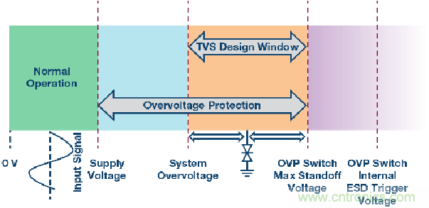 圖3顯示了一個(gè)與外部接口的系統(tǒng)輸入端的工作區(qū)域。最左邊的區(qū)域(綠色)表示正常工作區(qū)間,輸入電壓位于電源電壓范圍以內(nèi)。左起第二個(gè)區(qū)域(藍(lán)色)表示輸入端可能存在持續(xù)直流或長(zhǎng)時(shí)間交流過(guò)壓的范圍,原因是斷電、接線錯(cuò)誤或短路。另外,圖中最右側(cè)(紫色)是過(guò)壓開(kāi)關(guān)內(nèi)部ESD保護(hù)二極管的觸發(fā)電壓。選擇的TVS擊穿電壓(橙色)必須小于過(guò)壓保護(hù)開(kāi)關(guān)的最大承受電壓并且大于任何已知的可能持續(xù)直流或長(zhǎng)時(shí)間交流過(guò)壓,以免無(wú)意中觸發(fā)TVS。