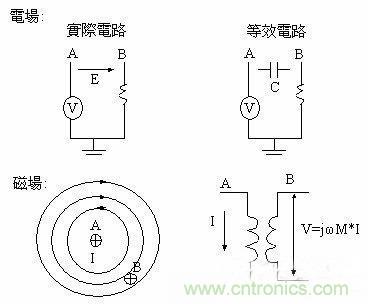 就Maxwell方程式的大多數(shù)應用而言,噪聲耦合方法可以代表等效組件的模型。例如:在兩個導體之間的一個時變電場,可以代表一個電容。在相同的兩導體之間,一個時變磁場可以代表互感(mutual inductance)。附圖二表示這兩種噪聲耦合機制。