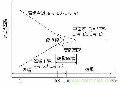 近場(near field)(磁和電的成份)和遠場的關系,如附圖一所示。所有的波都是磁場和電場成份的組合。這種組合稱作「PoynTIng向量」。實際上,是沒有一個單獨的電波或磁波存在的。我們之所以能夠測量到平面波,是因為對一個小天線而言,在距離來源端數(shù)個波長的地方,其波前(wavefront)看起來像平面一樣。