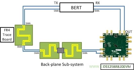 這一切聽起來很棒,但該工具能給您帶來可靠的結(jié)果嗎?為了回答這個問題,筆者去了實驗室,并進行了一些測量。筆者決定使用一個速率為12.5Gbps的Linear re-driver DS125BR820EVM、一些FR4印刷電路板(PCB)走線以及具有SMA連接器、適用于背板子系統(tǒng)的子卡。圖1展示了筆者的簡單設置。使用一個誤碼率測試器(BERT)作為為本次研究的發(fā)送器及接收器)。
