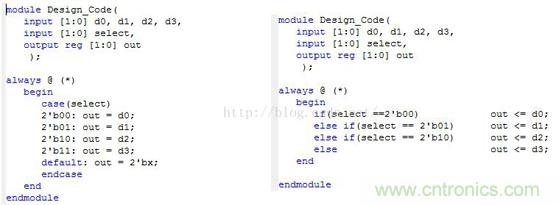 設(shè)計(jì)一個(gè)二位4路選擇器,由于選擇器使用條件觸發(fā)的方法對(duì)應(yīng)真值表進(jìn)行匹配輸出與輸入,因此可以聯(lián)想到在C程序設(shè)計(jì)中的條件語(yǔ)句“If”和“Case”兩種,那么這兩種設(shè)計(jì)從硬件的角度出發(fā)有什么不同呢?