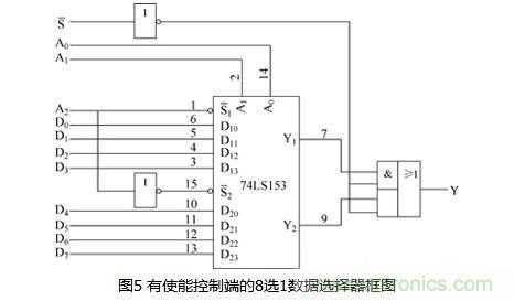 也可以添加使能控制端對(duì)所接成的8選1數(shù)據(jù)選擇器的工作狀態(tài)進(jìn)行控制。添加使能控制端的8選1數(shù)據(jù)選擇器的電路如圖5所示。