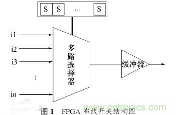 在FPGA各種資源中,可編程邏輯塊是實(shí)現(xiàn)用戶功能的基本單元,每個(gè)可編程邏輯塊包含1個(gè)互連開(kāi)關(guān)矩陣和4個(gè)SLICEs,其中每個(gè)SLICE包括2個(gè)查找表(Look-Up-Table,LUT)、2個(gè)觸發(fā)器和一些多路選擇器?;ミB開(kāi)關(guān)矩陣主要由不同長(zhǎng)度導(dǎo)線和多個(gè)布線開(kāi)關(guān)組成,典型的布線開(kāi)關(guān)結(jié)構(gòu)如圖1所示。