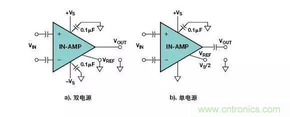類似的問題也會出現(xiàn)在儀表放大器電路中。圖3示出了使用兩只電容器進(jìn)行AC耦合的儀表放大器電路,沒有提供輸入偏置電流的返回路徑。這個(gè)問題在使用雙電源(圖3a)和單電源(圖3b)供電的儀表放大器電路中很常見。