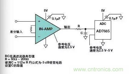 圖7.儀表放大器驅(qū)動(dòng)ADC的典型單電源電路