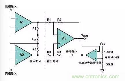 圖9.利用低輸出阻抗運(yùn)算放大器驅(qū)動(dòng)儀表放大器的參考電壓輸入端