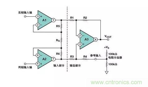 例如,流行的儀表放大器設(shè)計(jì)配置使用上圖所示的三運(yùn)放結(jié)構(gòu)。其信號總增益為