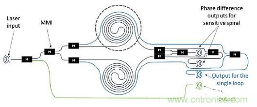 改進(jìn)后的MOM壓力傳感器設(shè)計(jì),MZI是平衡的;第一個(gè)是大范圍測量用單回路,第二個(gè)將敏感螺旋臂中的信號分成兩路去相位輸出,這樣就能始終對每一壓力進(jìn)行靈敏測量(圖3)。