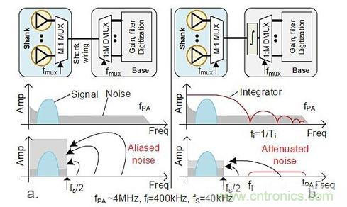 神經(jīng)探針的信號帶寬約為7.5kHz,可以采用15kHz對PA輸出采樣。設(shè)計(jì)人員發(fā)現(xiàn)可以將時(shí)分復(fù)用技術(shù)嵌入柄中(圖4a)。這樣做可以使每個(gè)獨(dú)特的柄線上有M個(gè)PA輸出。如果沒有加抗混疊濾波器進(jìn)行限制,則PA帶寬會由于折疊而產(chǎn)生帶內(nèi)噪聲。在采樣發(fā)生之前,將低通濾波器裝入這個(gè)小PA區(qū)域是不可能的。設(shè)計(jì)人員選擇使用能夠在Ti時(shí)間段對信號進(jìn)行積分的架構(gòu)(圖4b)來衰減超出采樣頻率fi的信號,從而提高信噪比(SNR)。