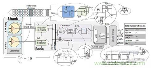 探針架構(gòu)設(shè)計(jì)(圖5)中的信號流,通過一條共享柄線從8個(gè)多路復(fù)用PA陣列的輸出流向底座。然后,該信號進(jìn)入探針底座中的積分器,積分器的輸出通過8個(gè)標(biāo)記為Vo的采樣保持電路進(jìn)行解復(fù)用。接下來,8個(gè)單獨(dú)的Vo中的每一個(gè)都進(jìn)入自己的信道模塊,它們對信號進(jìn)行放大和濾波,使得輸出僅有感興趣的頻帶。接下來,所有20個(gè)通道經(jīng)過多路復(fù)用并由10位逐次逼近寄存器式(SAR)模數(shù)轉(zhuǎn)換器(ADC)進(jìn)行數(shù)字化,并發(fā)送至為ADC和多路復(fù)用/多路解復(fù)用器(MUX/DEMUX)提供時(shí)鐘的數(shù)字控制模塊。在此,所有ADC的并行輸出經(jīng)串行化后僅有6條數(shù)據(jù)線。