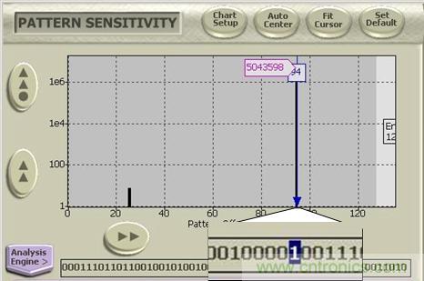 在客戶進行誤碼測試的時候,由于鏈路的損耗和芯片的輸出特性,導致出現(xiàn)了誤碼,但客戶卻想知道究竟是哪一個bit位出現(xiàn)了誤碼,以定位誤碼出現(xiàn)的根源。設(shè)置Bert的輸出/輸入端設(shè)置為PRBS7的碼型,在誤碼分析功能里面選擇Patten Sensitivity,則可以直接觀察PRBS7的127個比特的每一位所出現(xiàn)誤碼的個數(shù),看最多誤碼所對應(yīng)的比特位的前后特性,如下圖十三,移動光標到任意一個比特上面,可以看到連續(xù)多個0而中間有一個1跳變的bit即127比特的第94比特出現(xiàn)誤碼的個數(shù)最多,達到5043598個誤碼。從而判斷由于鏈路ISI的影響導致突然的跳變位出現(xiàn)較高的誤碼率。