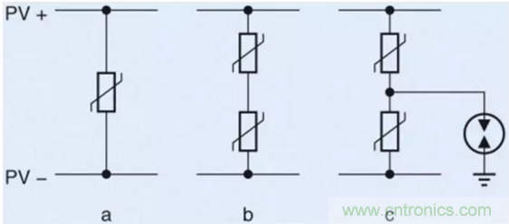 額定電壓為1000 V DC的金屬氧化物壓敏電阻通常用于太陽(yáng)能逆變器的直流輸入。根據(jù)待處理線路電壓,例如電壓為300 VRMS的壓敏電阻可以是變頻器輸出的首選。在這兩種情況下,也可使用充氣式氣體放電管以實(shí)現(xiàn)額外防護(hù)。圖2為太陽(yáng)能逆變器直流輸入的常用電路設(shè)計(jì):最簡(jiǎn)化版本(圖2a)僅使用一個(gè)額定電壓為1000 VRMS的壓敏電阻(例如片狀,直徑20毫米)。在這種情況下,額定直流電壓為1414 V DC,而鉗位電壓在100 A時(shí)為2970 V。圖2b所示電路通過(guò)串聯(lián)的兩個(gè)壓敏電阻運(yùn)作,兩元件應(yīng)專(zhuān)用于550 VRMS (745 V DC),以提供相同保護(hù)。這一設(shè)計(jì)提供了一大優(yōu)點(diǎn):鉗位電壓在電流為100 A時(shí)僅為2710 V,從而進(jìn)一步抑制過(guò)電壓。此外,待吸收能量將平均分布于兩個(gè)組件,從而降低負(fù)荷系數(shù)。圖2c所示電路則在壓敏電阻與地面之間添加了一個(gè)氣體放電管。這一設(shè)計(jì)仍將提供充分保護(hù),特別是當(dāng)單個(gè)或兩個(gè)壓敏電阻出現(xiàn)故障或因負(fù)荷導(dǎo)致老化時(shí)。必須使用氣體放電管,以免當(dāng)兩個(gè)壓敏電阻同時(shí)故障時(shí)進(jìn)入持續(xù)導(dǎo)電狀態(tài)。